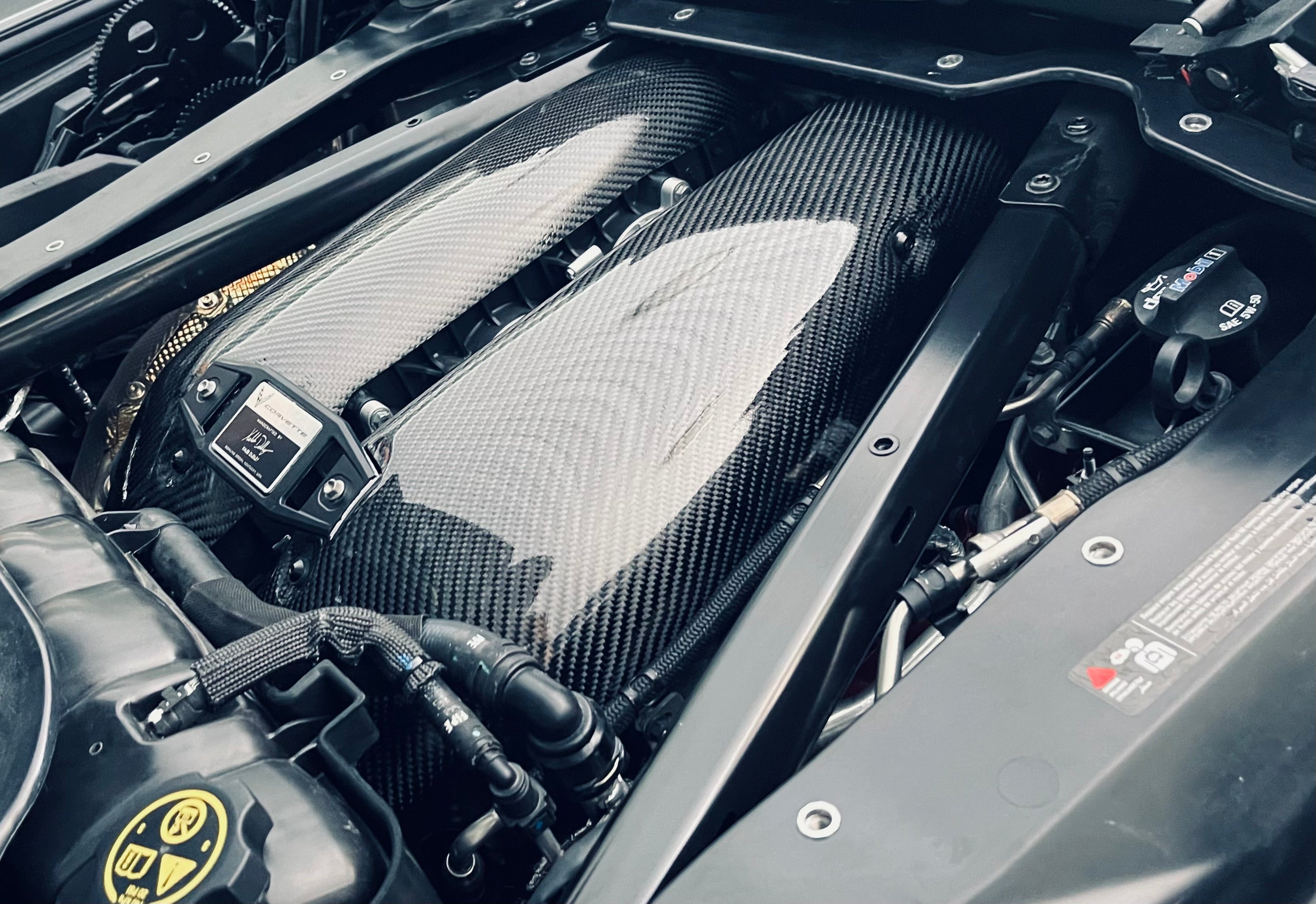 The Hulse Designs LT6 intake manifold covers take the look of the intake manifold up to the level it performs at! These covers are form-fitting to the manifold and hug the lines and even hide a bit of wiring and sensors near the intake throttle bodies. They really clean up the crown jewel of the whole Z06 platform. Made from first quality carbon fiber (same style as what OEM uses), these covers are lightweight and strong. They attach with titanium hardware to the same mounting locations that the optional GM cover attaches to. They also will fit in conjunction with an X-brace, so you can now have the looks without compromising performance! They are also low profile and fit on the HTC convertible platform as well. In fact, they were initially developed on a HTC to perfect the fitment.